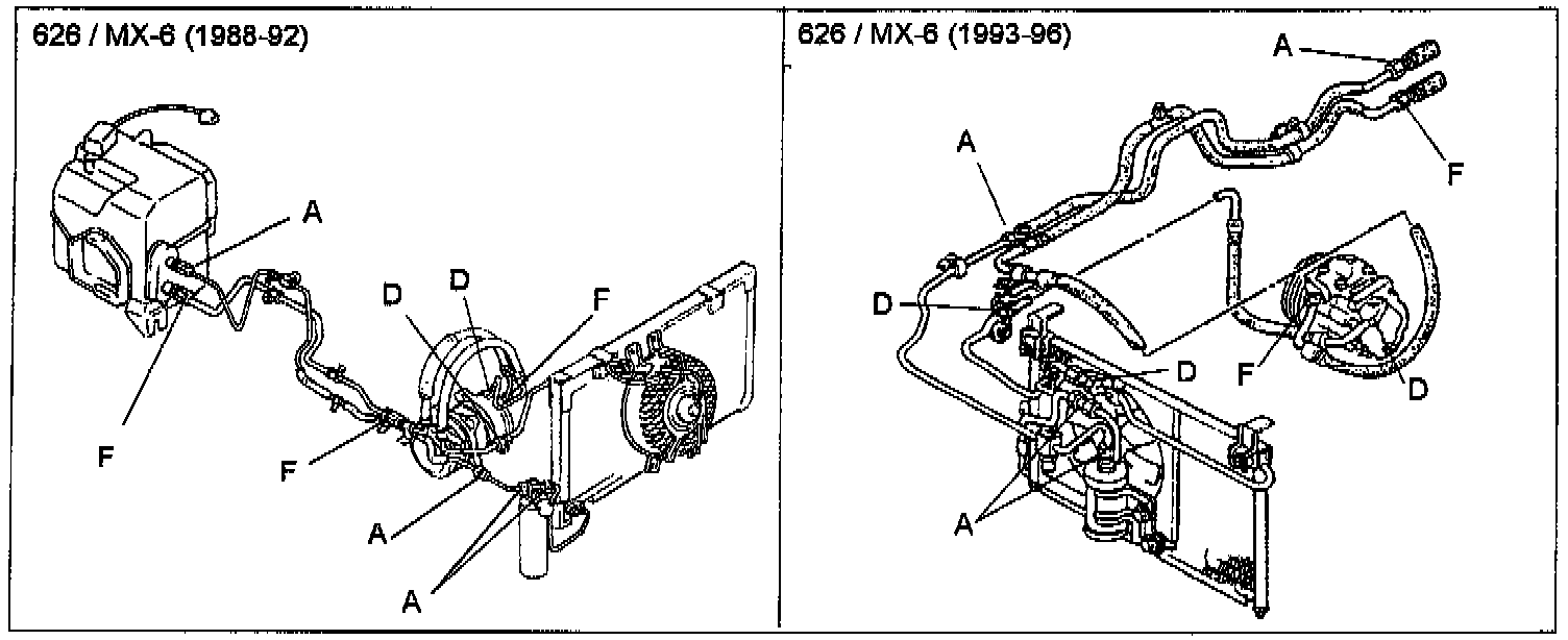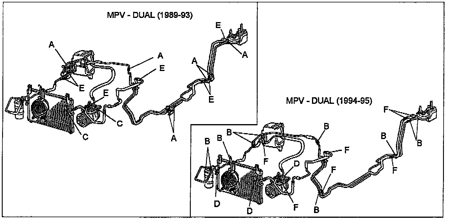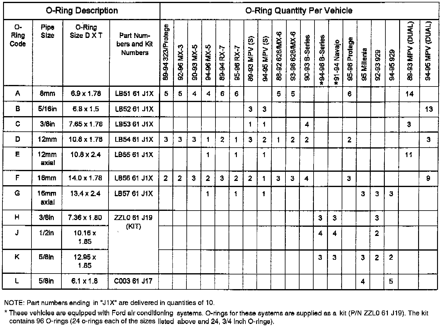 Refer to the illustrations and the chart when replacing air conditioning system 0-rings. These 0-rings are designed for use in both R12 and R134 air conditioning systems.
