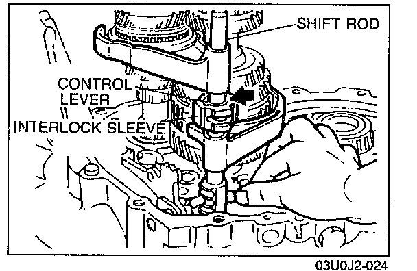 1. Align the ends of the interlock sleeve and of the control lever (arrow). Turn the shift rod counterclockwise.