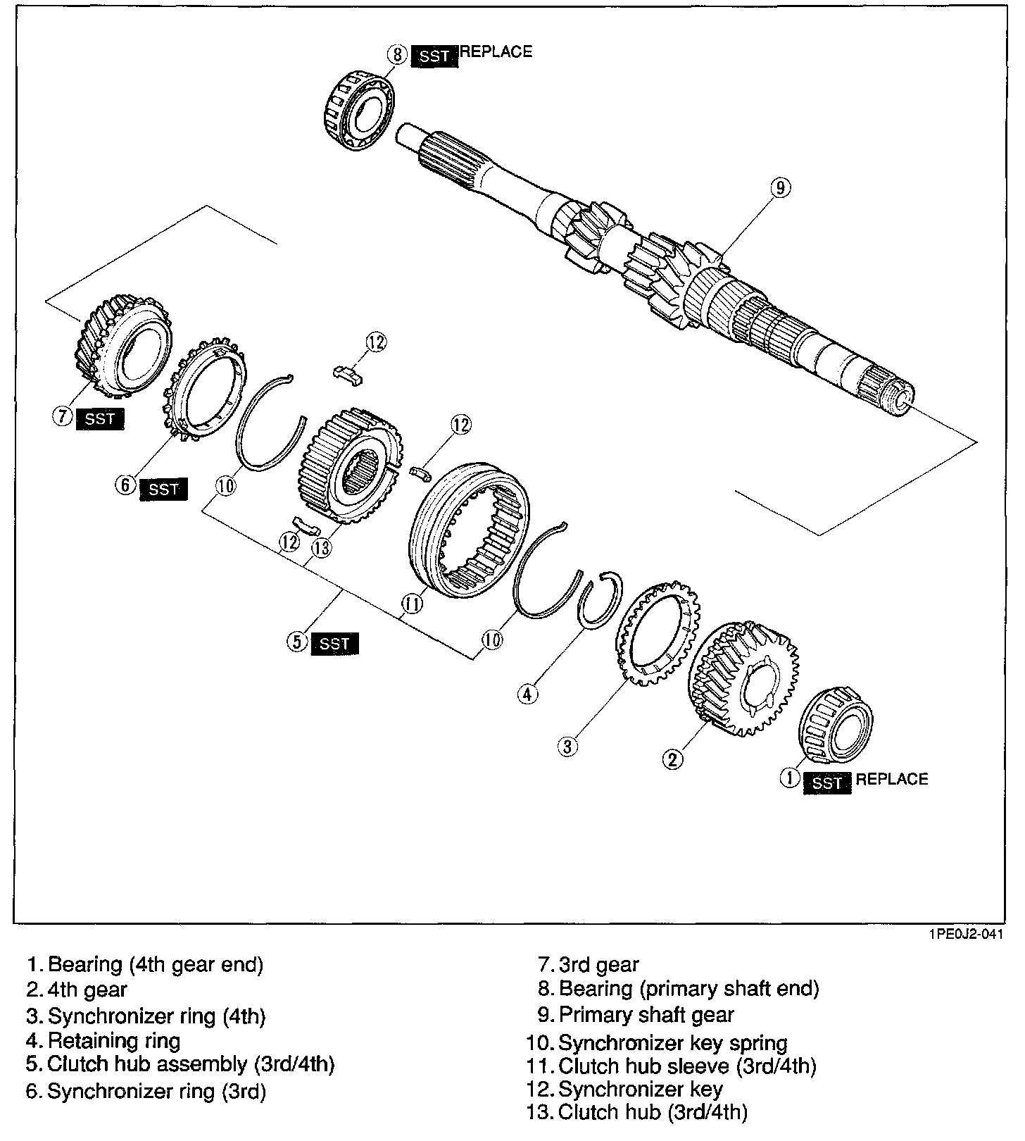 2. Remove the clutch hub assembly (3rd/4th), synchronizer ring (3rd), and 3rd gear by using the SST.