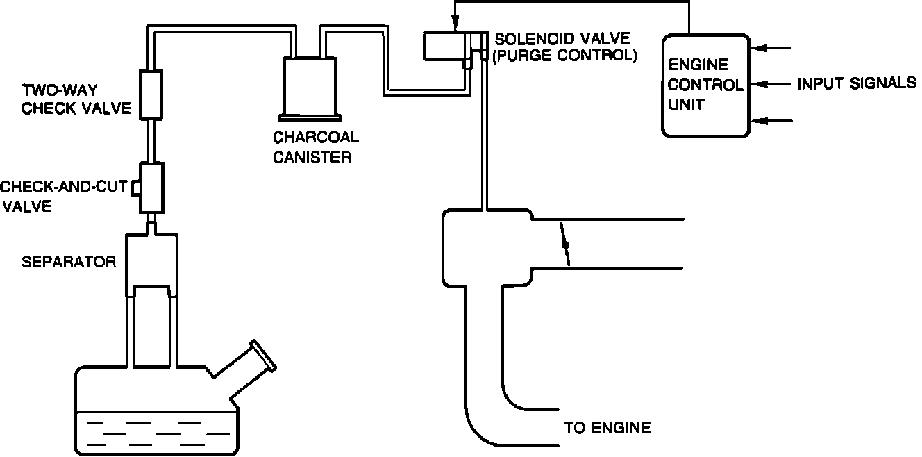 The EVAP system is ECU controlled. System consists of a vapor separator, purge control solenoid valve, charcoal canister, two-way check valve, three-way check valve, vapor separator, ECU, and engine sensors.