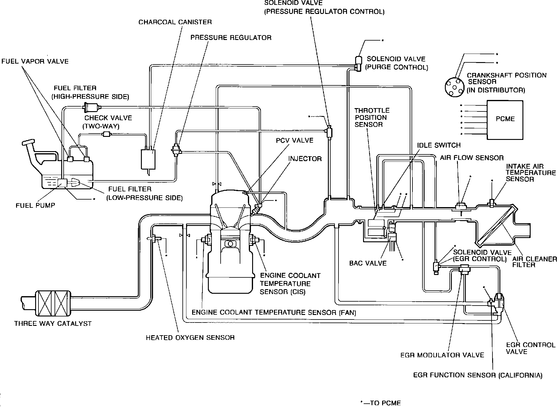 The Powertrain Control Module (PCME) is the central component of this computerized fuel, ignition and emission control system. To maintain fuel economy, good driveability and reduced vehicle emissions, the PCME monitors data from various sensors and controls functions such as the fuel injection system (air/fuel ratio), emission control devices, automatic transmission operation, and on-board diagnostics.