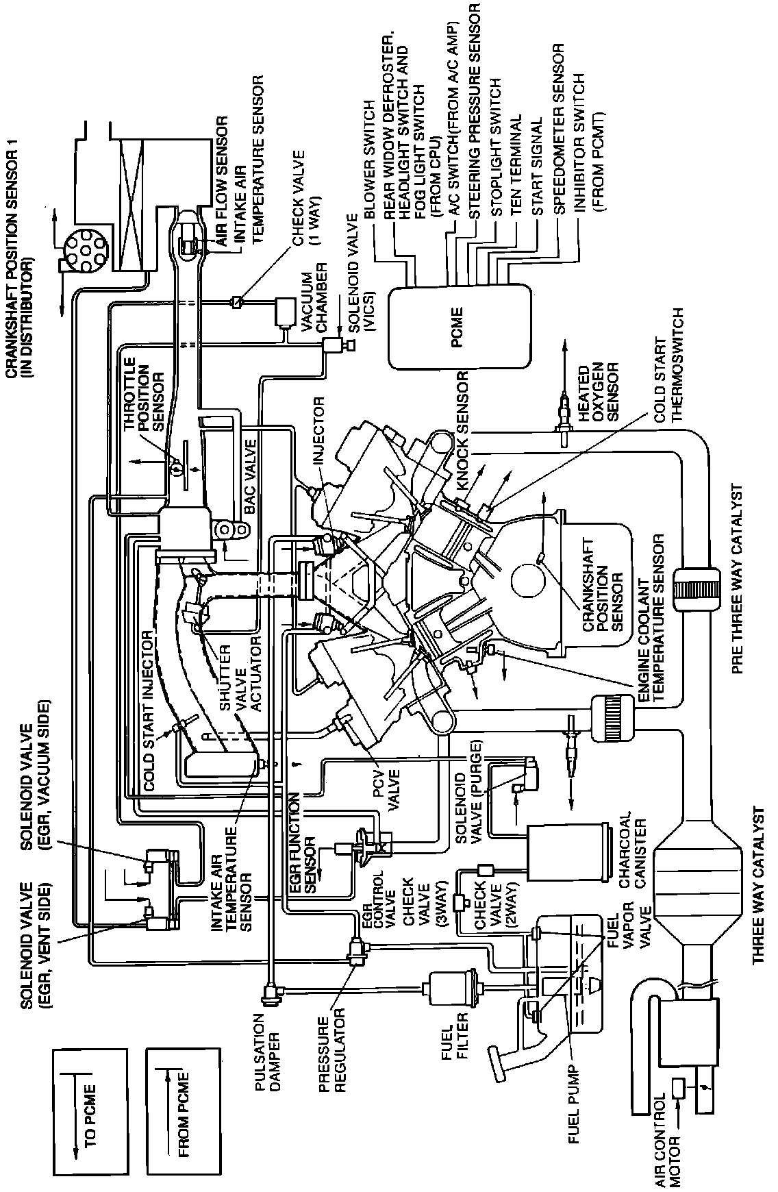 When the engine warms up, the fuel injection system switches to "CLOSED LOOP" operation. In this mode, the computer monitors several sensors in addition to the air flow meter and temperature sensor, including an exhaust gas oxygen sensor. Signals from the oxygen sensor tell the PCME if the air/fuel ratio is rich or lean. The PCME then modifies the base pulse width accordingly to increase or decrease the amount of fuel being injected, depending on the need at that moment. Injector pulse width is adjusted several times each second to maintain the air/fuel ratio as close as possible to the ideal ratio.