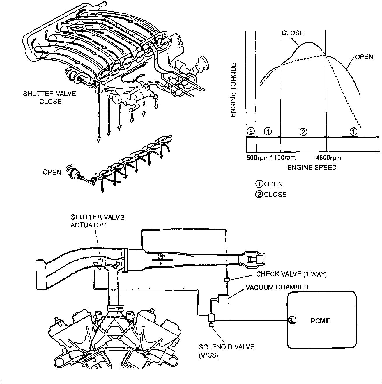 The intake manifold has two paths that air can take on the way to the cylinders, a long and a short path. The two paths are separated by a shutter valve, like a throttle valve in each intake runner. When the shutter valves are closed, air must take the long path. When the valves are open, air can take a more direct short path to the engine. The PCME opens and closes the shutter valves at different engine speeds to take advantage of harmonic oscillations in the intake manifold runners. This helps "pack" more fuel and air into the cylinders during each cylinder cycle (improved volumetric efficiency), increasing torque and horsepower over a broader rpm range.