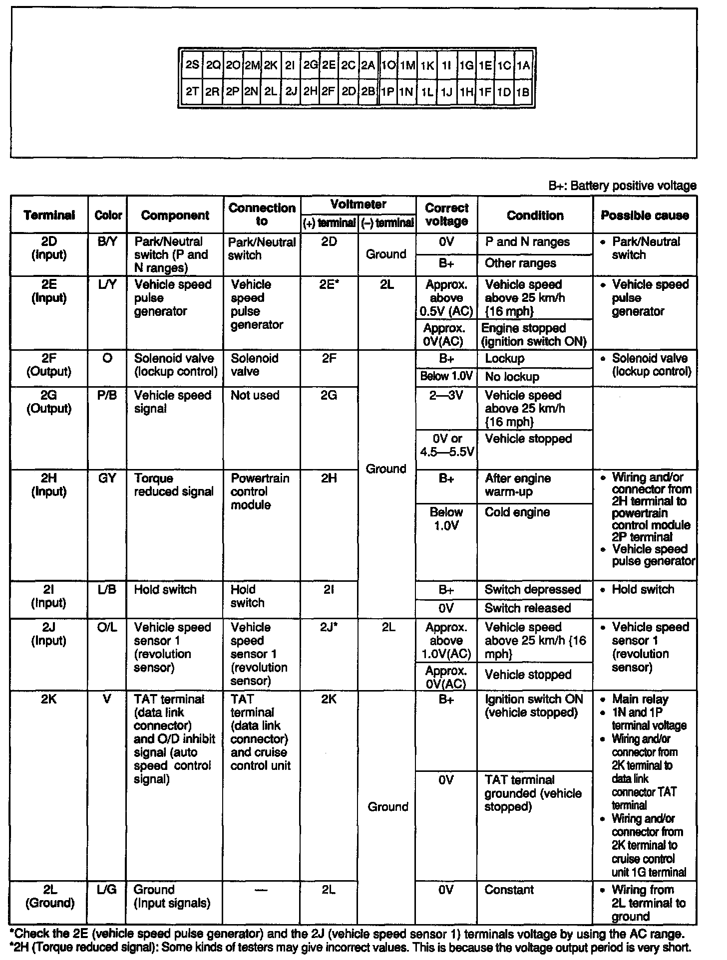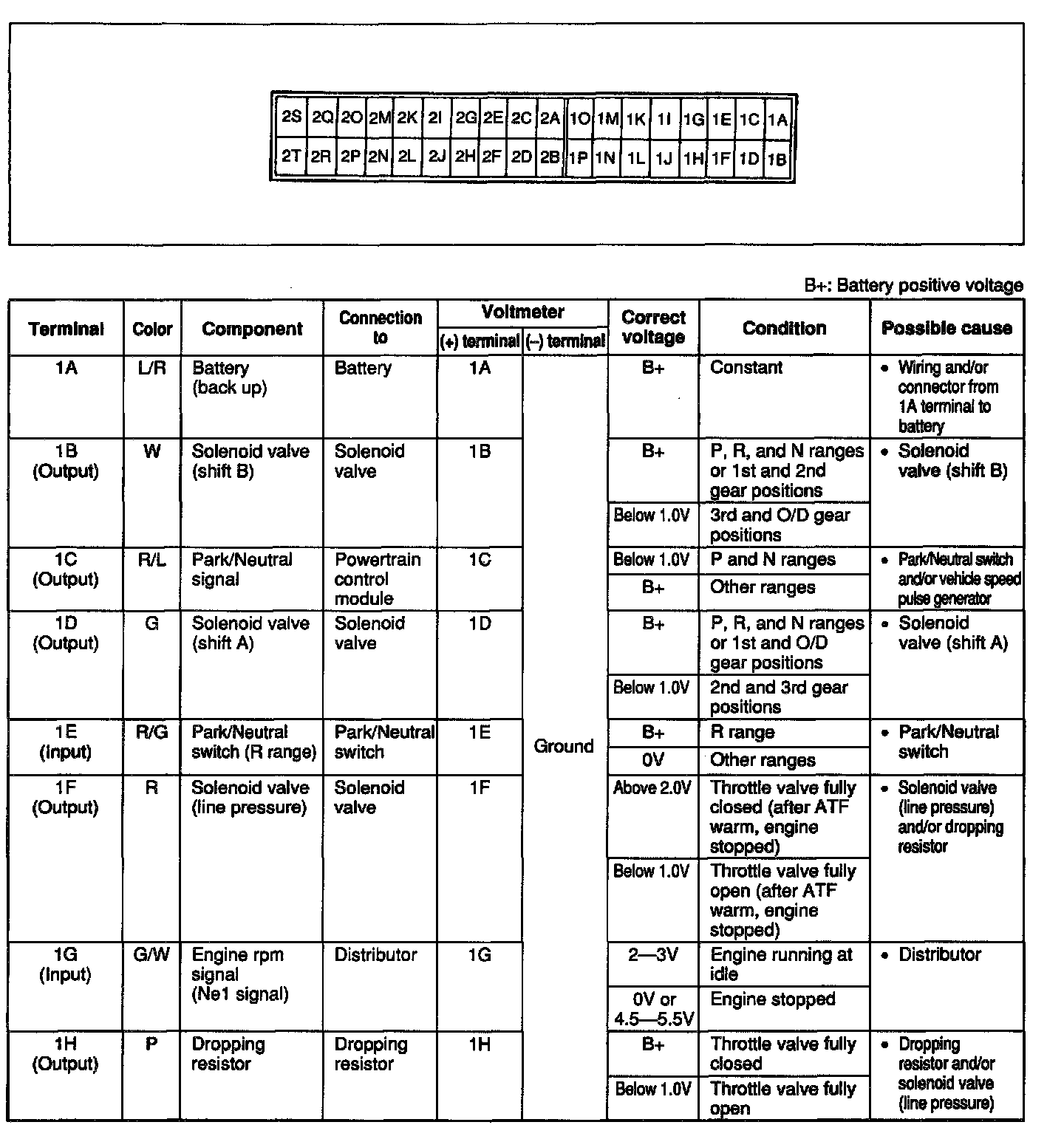 CAUTION: The 1 D terminal voltage [solenoid valve (shift A)] is below 1.0 V when in HOLD mode in P, R, and N ranges.