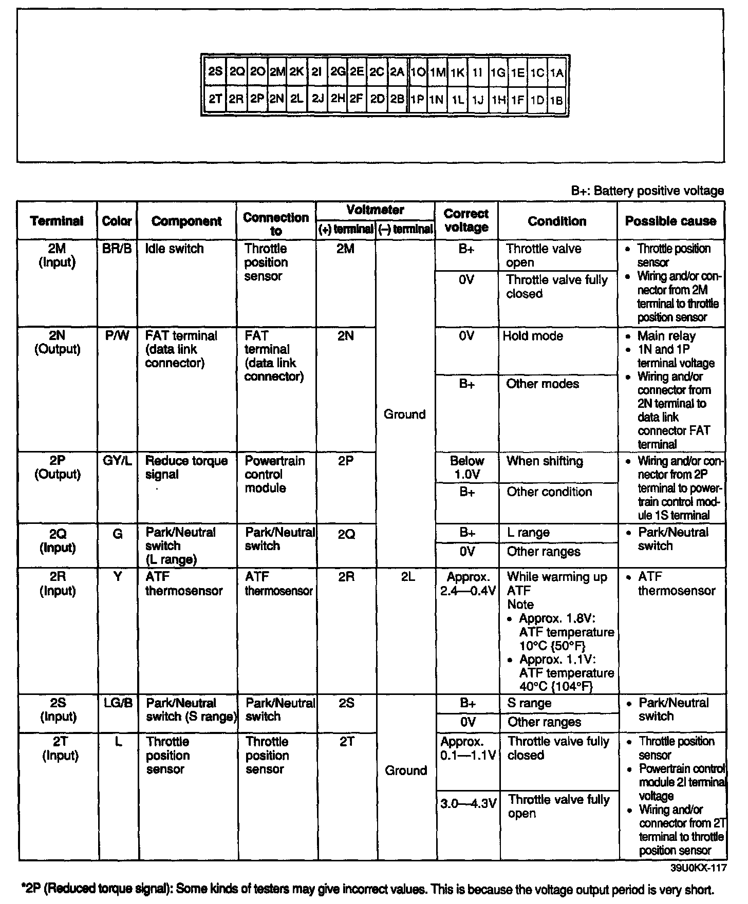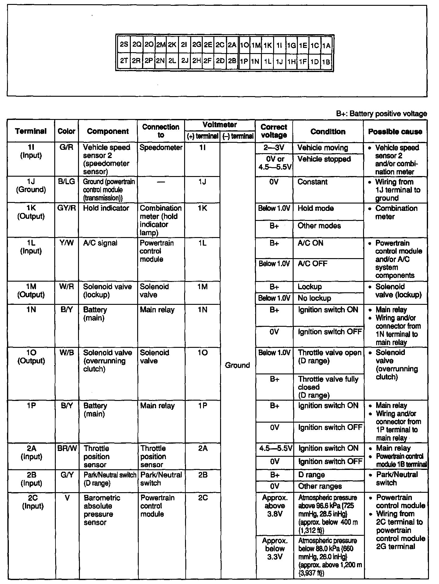 7. If any powertrain control module (transmission) terminal voltage is incorrect, check the related input or output devices and wiring. If no problem is found, replace the powertrain control module (transmission).