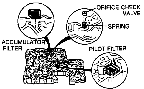 - Be careful not to drop the pilot filter, orifice check valve, spring, or accumulator filter.