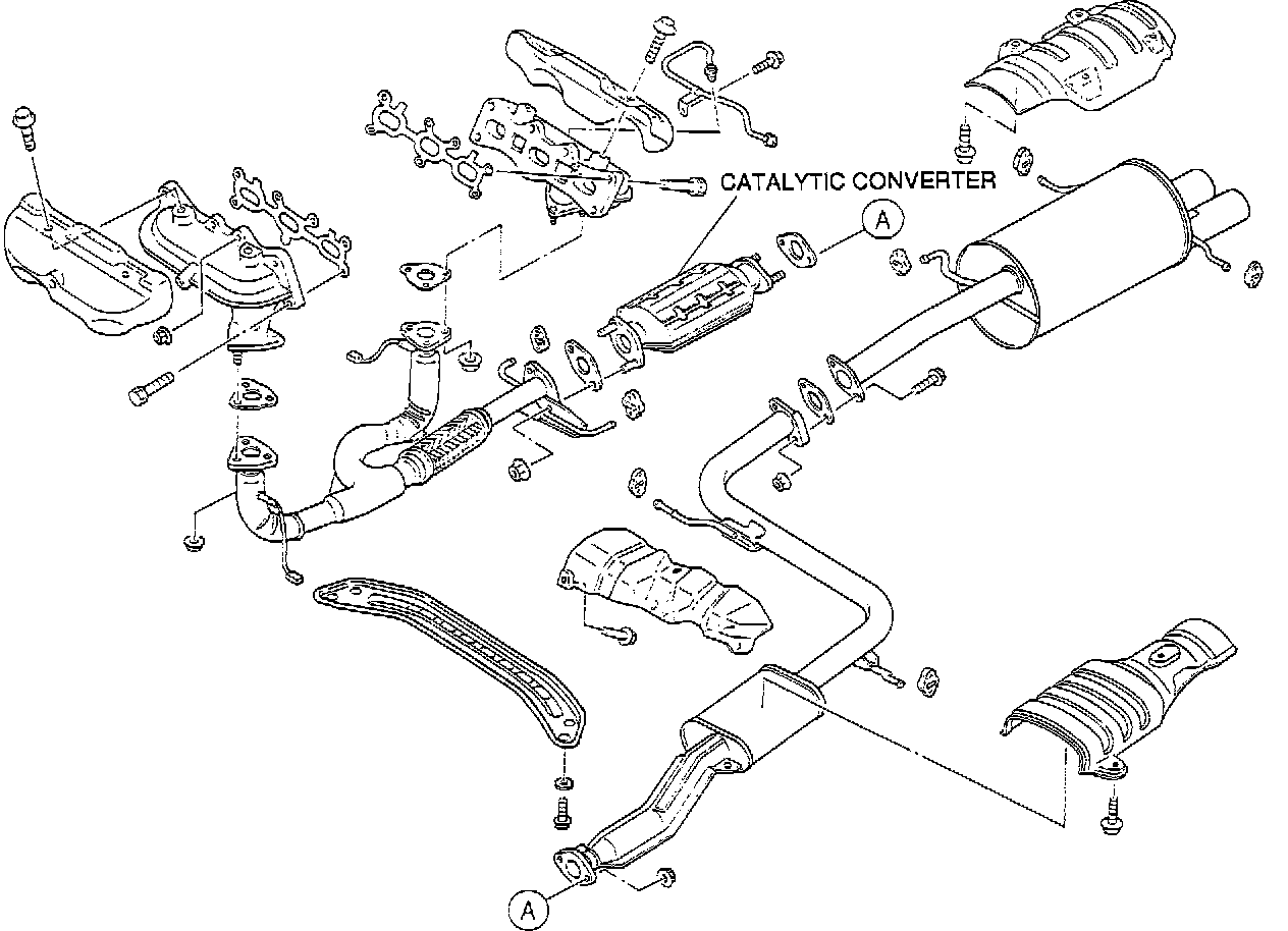 A three-way catalytic converter downstream from the exhaust manifold reduces oxides of nitrogen (NOx) and oxidizes hydrocarbons (HC) and carbon monoxide (CO). The converter contains catalyst elements platinum, rhodium and palladium. These metals promote oxidation and reduction reactions at high temperatures. Emissions are converted into carbon dioxide, water vapor and nitrogen.