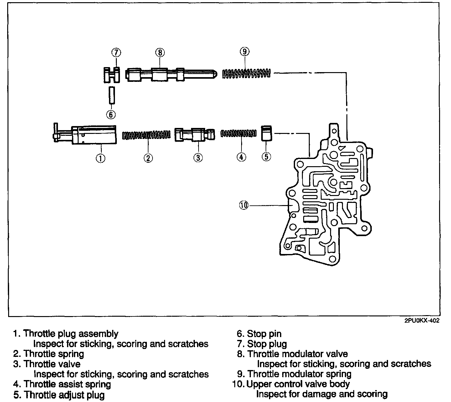 1. Insert the throttle modulator spring, throttle modulator valve, and stop plug. Secure them with the stop pin.