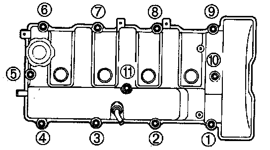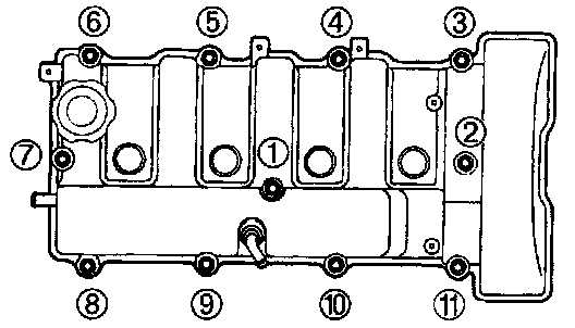 - Loosen the cylinder head cover bolts in two or three steps in the order shown.