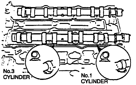 1. Assemble camshaft onto the cylinder head, facing the cam noses at No.1 and No.3 cylinders as shown.