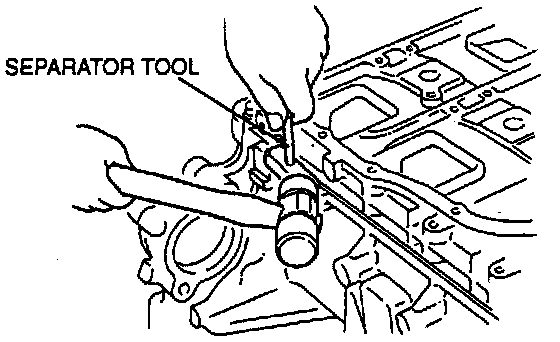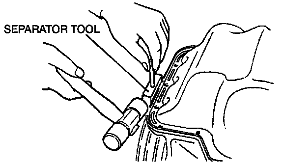CAUTION: Do not force a prying tool between the oil pan upper block and the oil pan which may damage the contact surfaces.