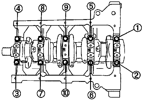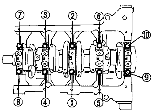 2. Loosen the main bearing cap bolts in two or three steps in the order shown.