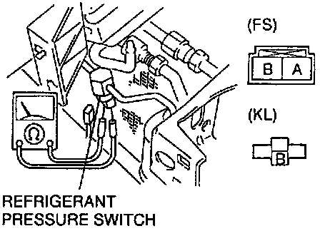 2. Disconnect the refrigerant pressure switch connector and verify that there is continuity between the switch terminals.