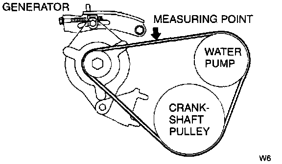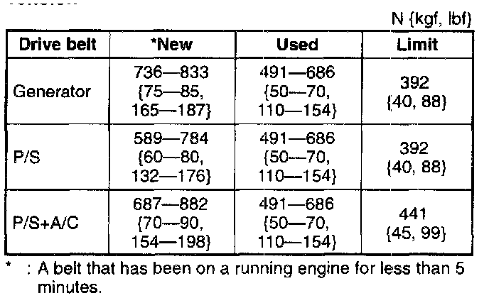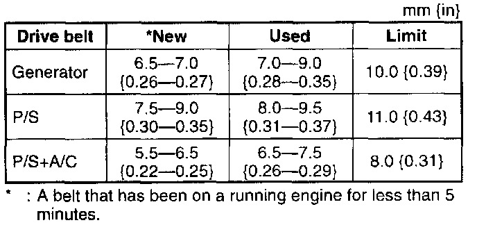 1. Verify the drive belt deflection when the engine is cold, or at least 30 minutes after the engine has stopped. Apply moderate pressure 98 N {10 kgf, 22 lbs.} midway between the specified pulleys.
