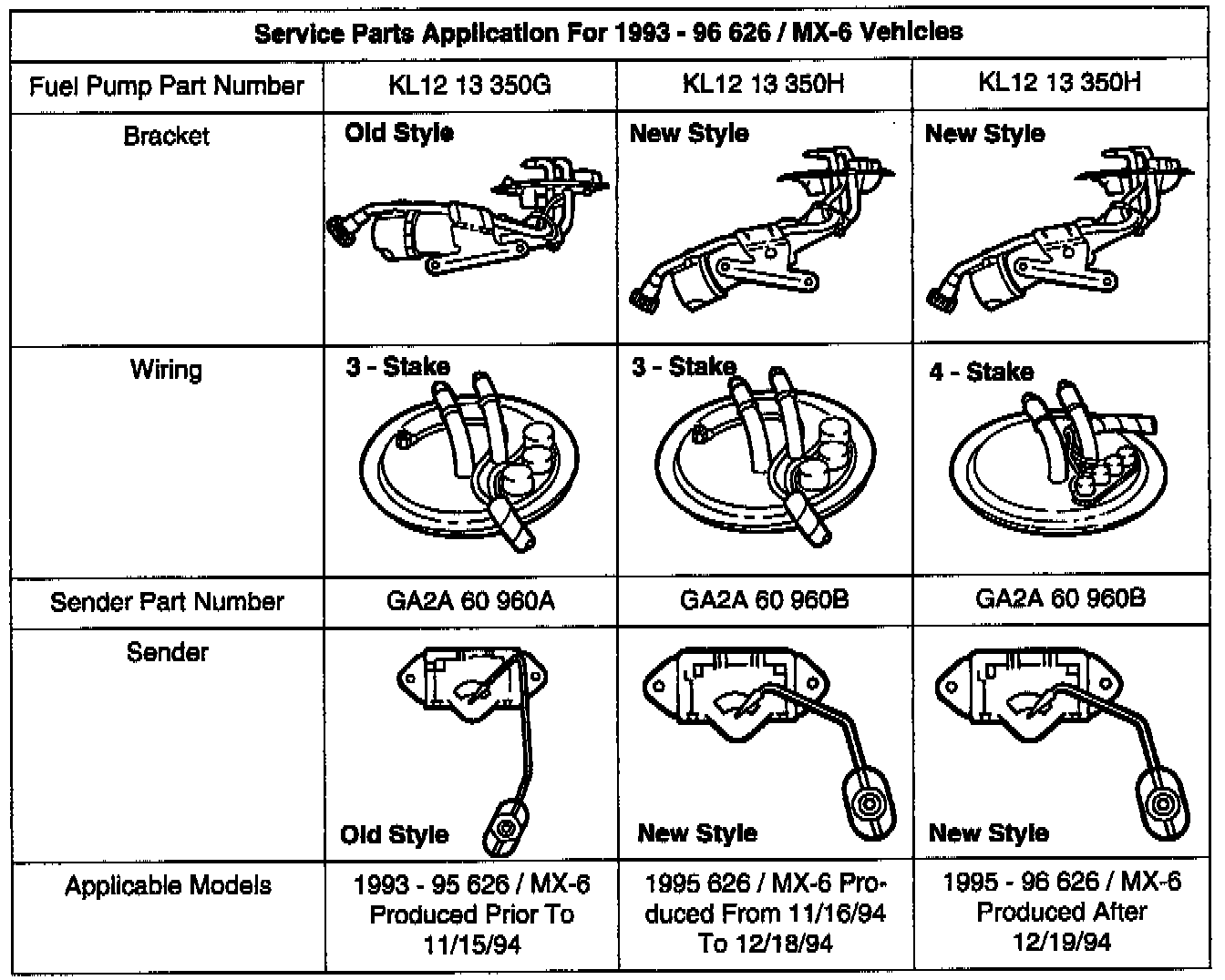Due to production changes, the configuration of the fuel pump and sender assemblies have changed. These fuel pumps and sender assemblies are not interchangeable. Please refer to the chart when ordering service parts.