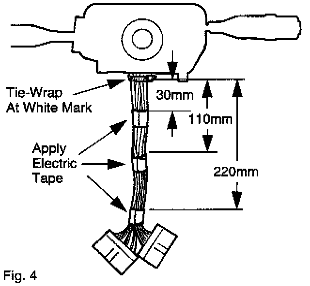 11. Measure the following distances from the tie-wrap toward the connectors and wrap one (1) piece of electrical tape around the harness at those locations. Refer to Fig. 4.