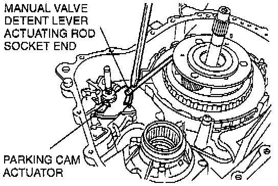 62. Snap the socket end of the manual valve detent lever actuating rod on the parking cam actuator.