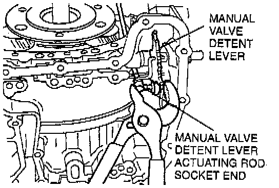 63. Snap the opposite socket end of the manual valve detent lever actuating rod on the manual valve detent lever.