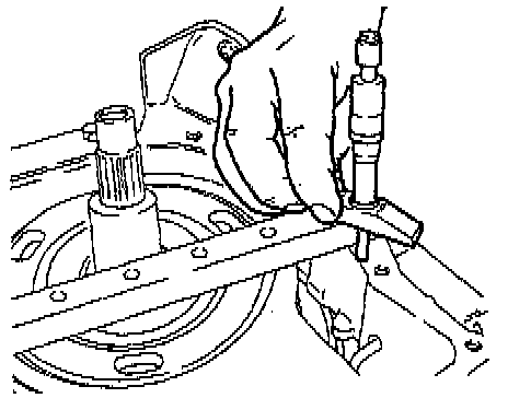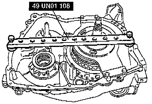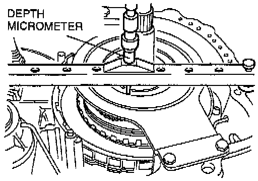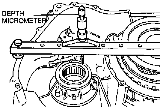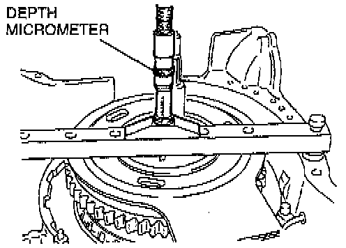 66. Use a depth micrometer to measure the distance from the top of the gauge bar to the bearing surface on the reverse/fourth gear carrier. Repeat this measurement on the other side of the turbine shaft. Average the two measurements. This is dimension A.
