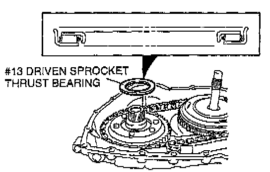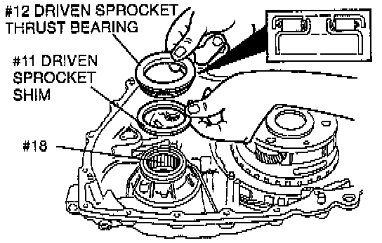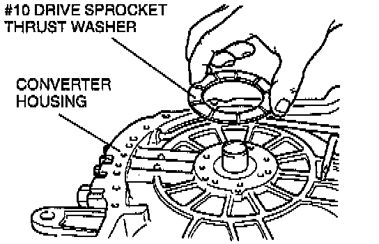 83. Remove the gauge bar and preload tool. Apply petroleum jelly to the selected #10 drive sprocket thrust washer and install on the converter housing. Remove the drive sprocket.