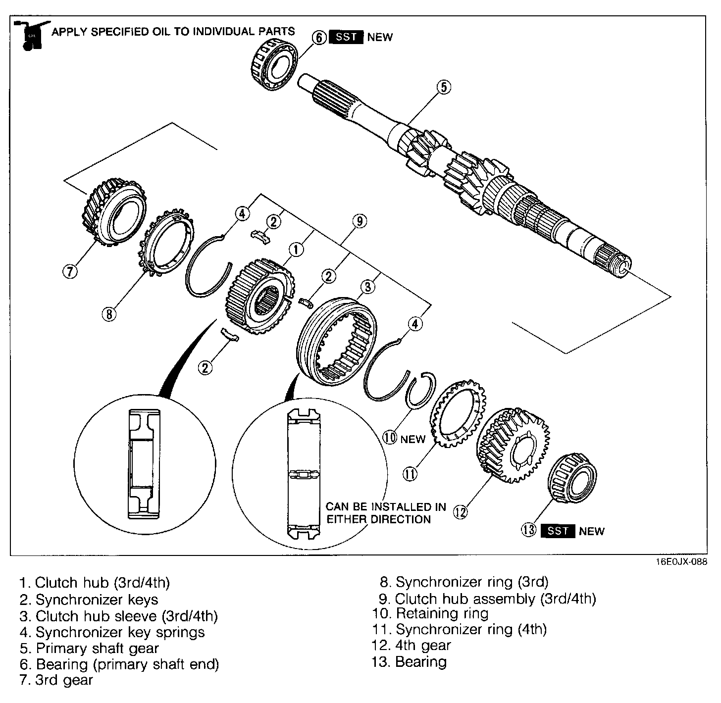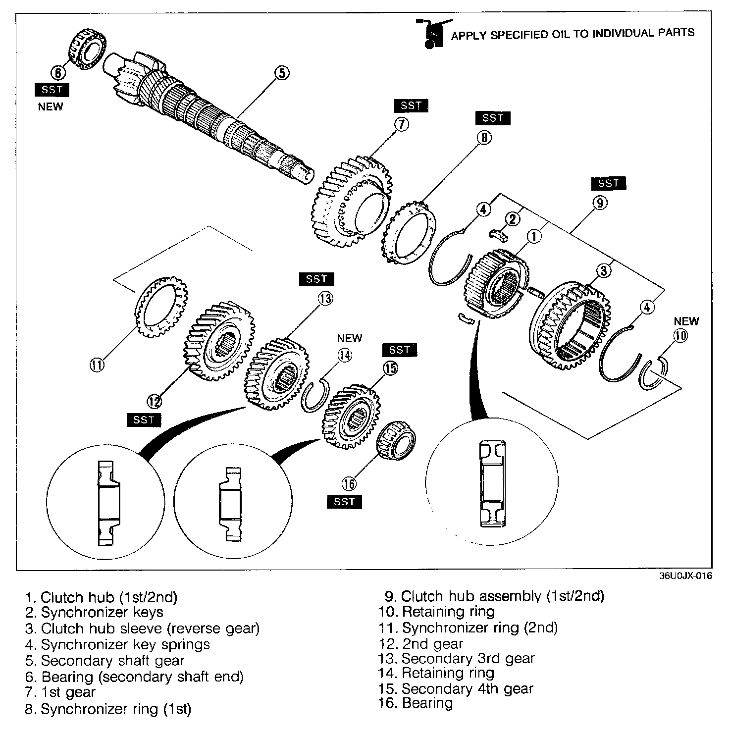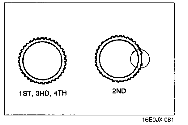 - The size of the 1st, 2nd, 3rd, and 4th synchronizer rings are the same. Be careful when installing them. The 2nd ring has the cut-out as shown in the image.
