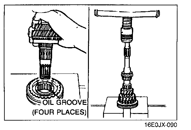 Install the 3rd gear, synchronizer ring (3rd), and clutch hub assembly (3rd/4th) by using a press.