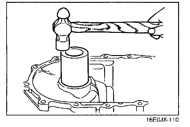 2. Mount the clutch housing onto the transaxle hanger, and set the differential bearing race into the clutch housing. Position a piece of pipe against the bearing race and tap it in until it contacts the clutch housing.
