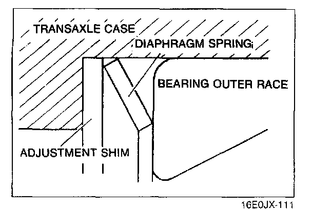 1. Install the primary and secondary shaft bearing races into the transaxle case (diaphragm springs and shims removed).