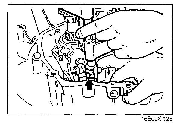 3. With the edge of the control end against the scraper, when the control end is pushed in the direction of the arrow in the image so that the ball goes into the shaft, the rod will at the same time line up with the shift rod coupling hole in the clutch housing.