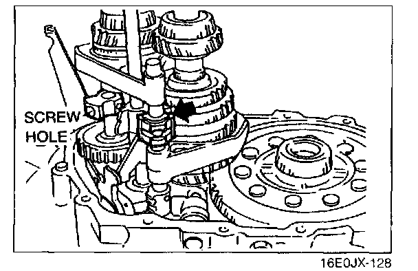 3. Align the end of the interlock sleeve with the control lever (arrow), and, at the same time, face the reverse idler shaft screw hole in the direction shown in the image.