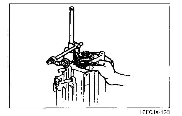 4. Set each clutch hub sleeve to the neutral position, and tap the shift rod from above so that the steel ball goes into the center groove (of the three grooves in the control end).