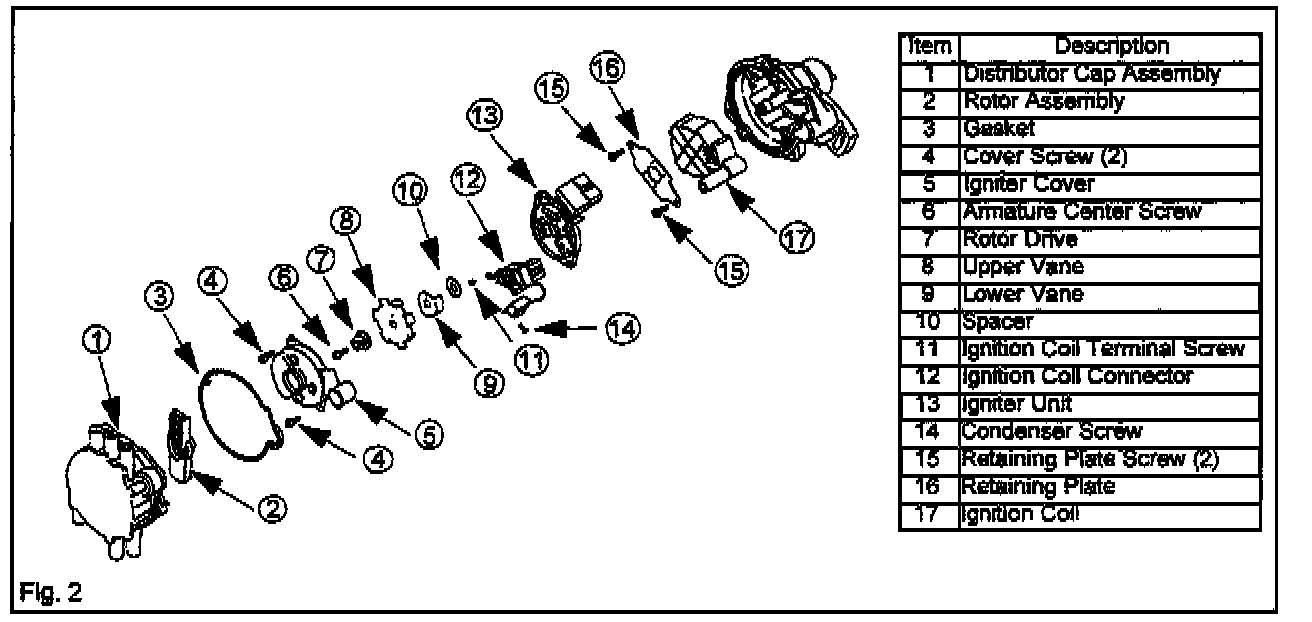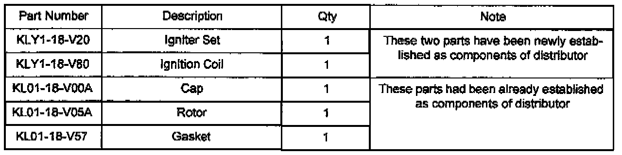 To improve the serviceability, the igniter set and the ignition coil (Fig. 1) have been newly established as components of the distributor in addition to the cap, the rotor and the gasket The igniter set includes an igniter unit, vanes, ignition coil connector and all screws (except cap screws).