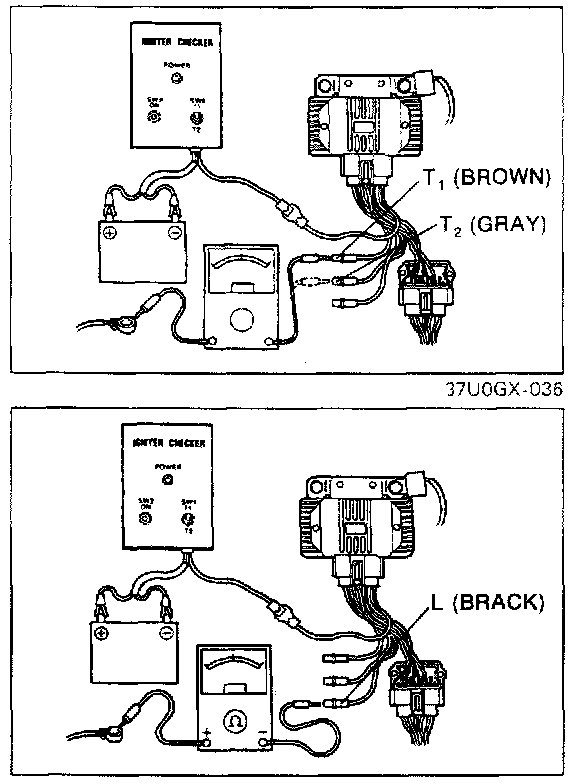 NOTE: Before inspection, make sure battery is at or near full charge. Test requires use of Mazda SST's or equivalent. On SST IGNITER CHECKER, Switch 1 may be in any position.
