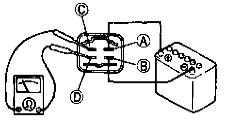 2. Unplug relay connector. Check that there is no continuity across terminals "C" and "D."