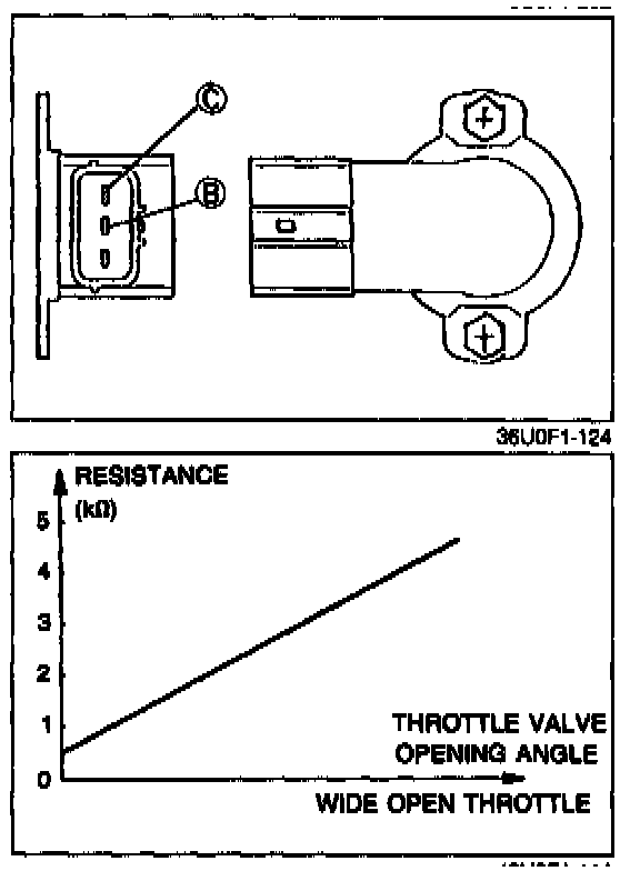 4. With throttle fully closed, resistance should be below 1K ohms. At wide open throttle, resistance should be approximately 5K ohms.