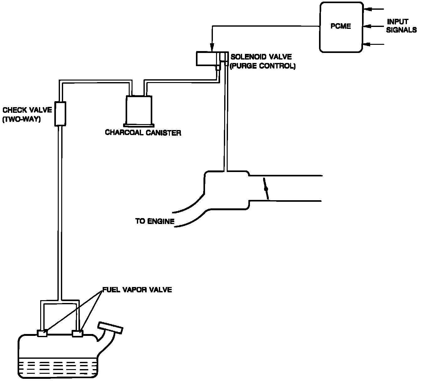 Prevent evaporative fuel vapors from entering the atmosphere. System consists of a fuel vapor valve, two-way check valve, charcoal canister, purge control solenoid valve, PCME, and input devices.