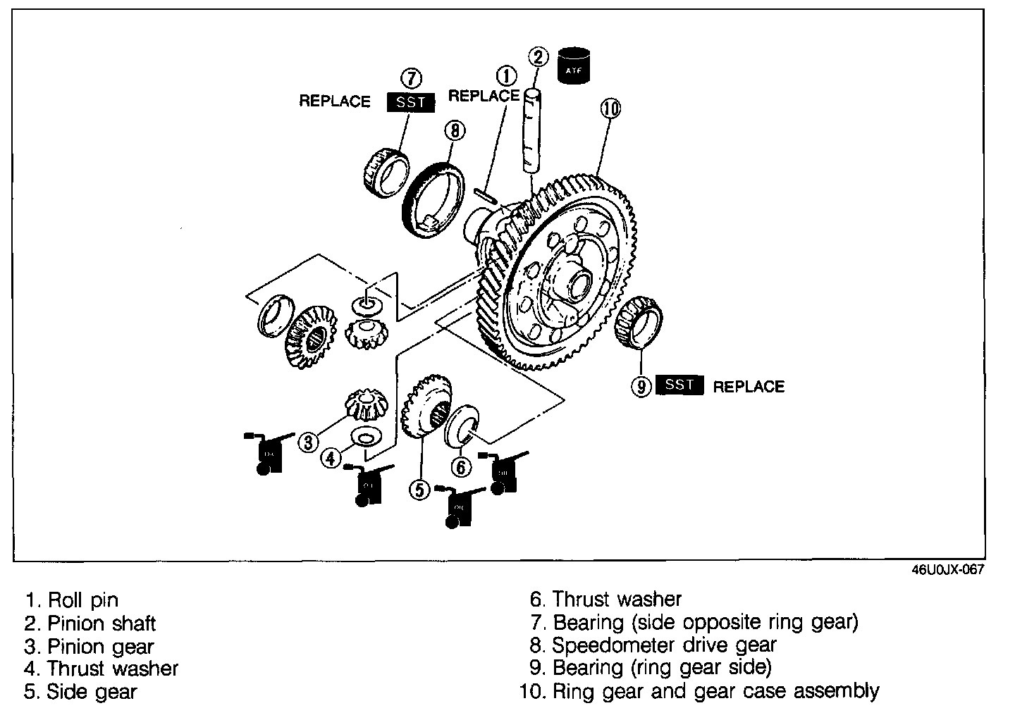 NOTE: The bearings do not need to be removed unless you are replacing them.1. Before disassembly, inspect the backlash of the side gears and pinion gears, referring to Preinspection.