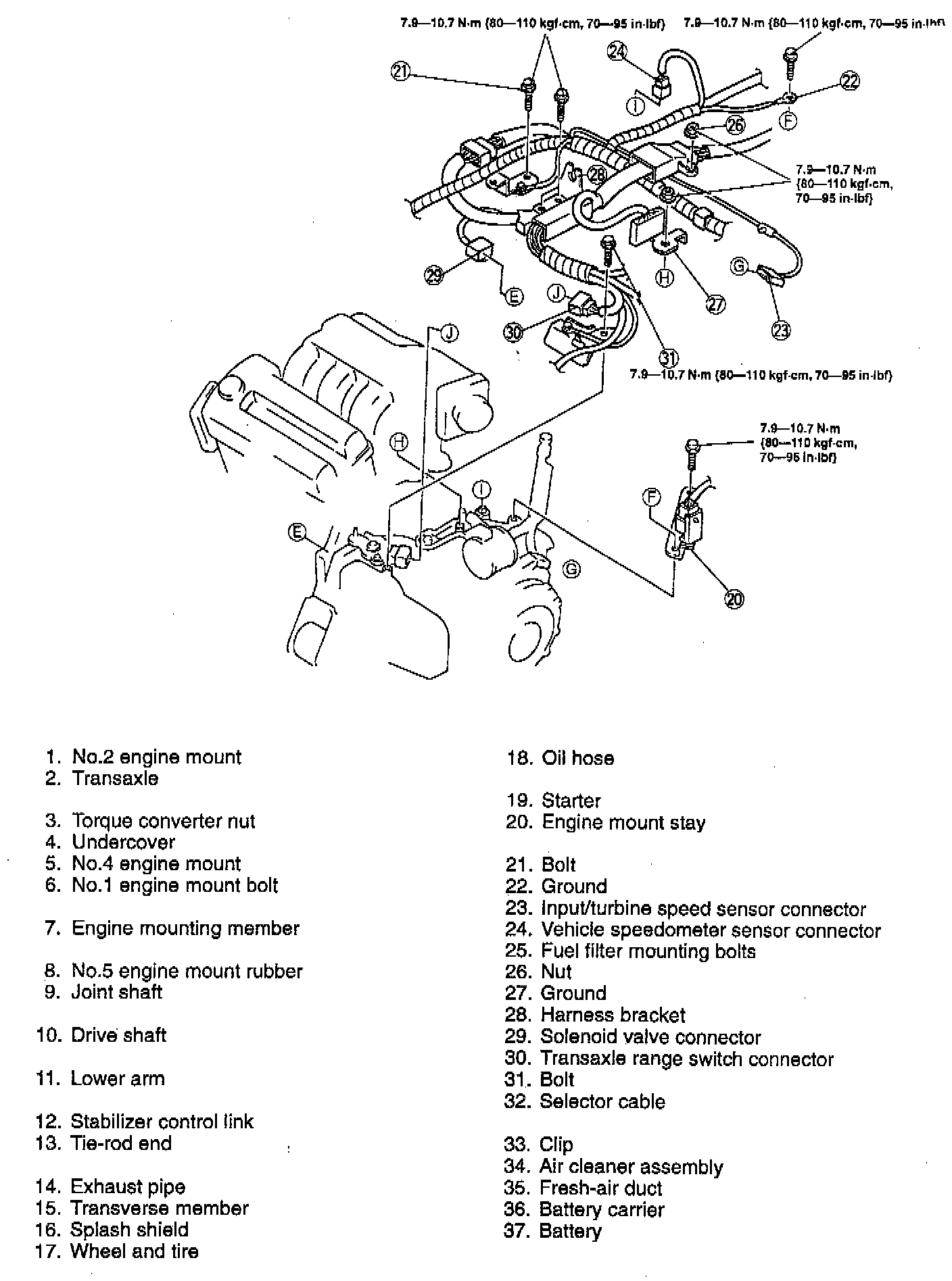 2. Install the transaxle mounting bolts and tighten to 68 - 99 Nm (50 - 73 ft. lbs.).