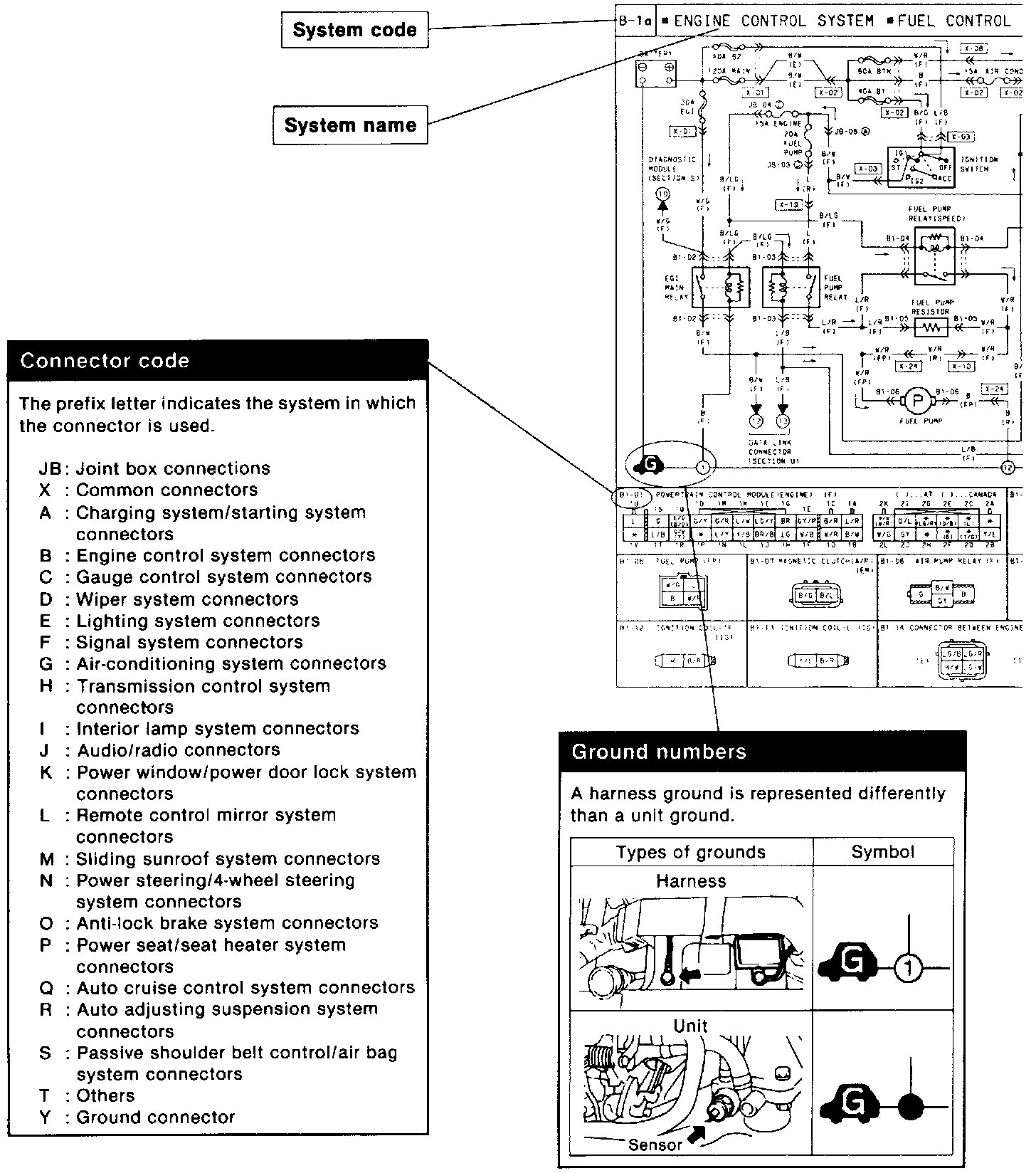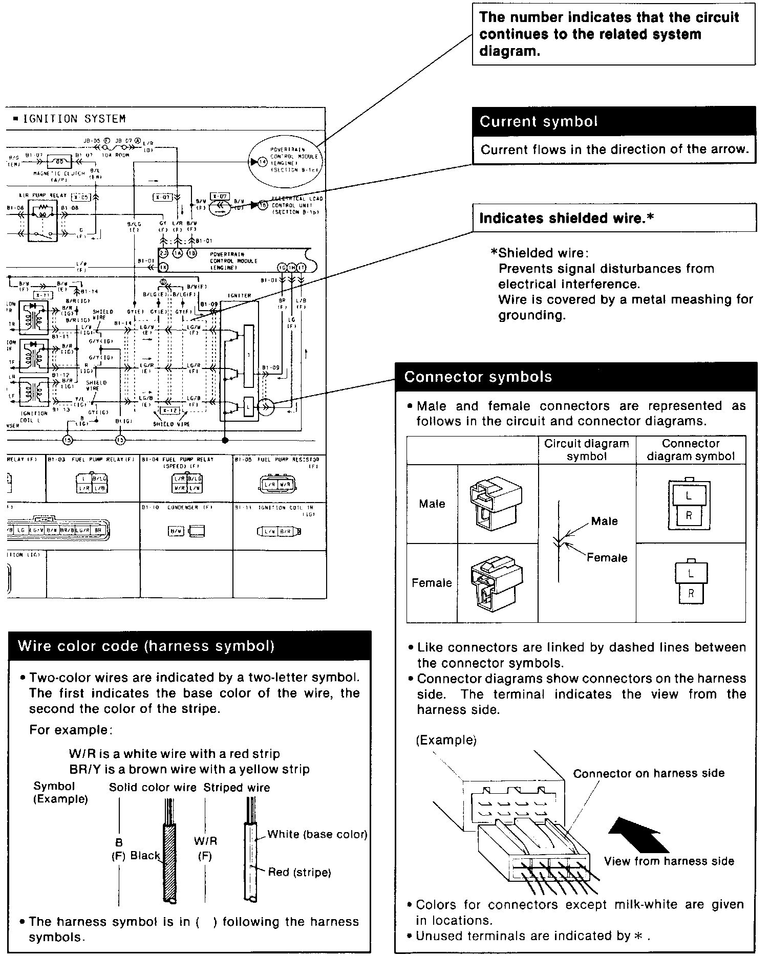 ^ These show the circuits for each system, from the power supply to the ground. The power supply side is on the upper part of the image, the ground side on the lower part. The diagrams describe circuits with the ignition switch off.