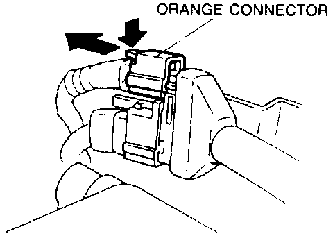 ^ Before replacement of any air bag system component or before disconnecting any connector of the system, first disconnect the negative battery cable; then disconnect the diagnostic module connector and connect the SST to it as shown in the figure.
