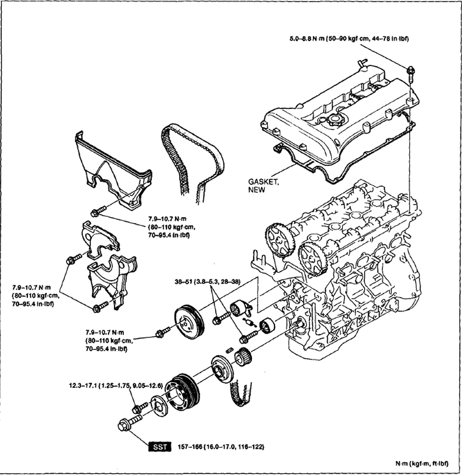 11. Measure the timing belt deflection by applying moderate pressure 98 N {1 0 kgf, 22 Ibf} midway between the camshaft pulleys. If the deflection is not correct, repeat from step 8 above.