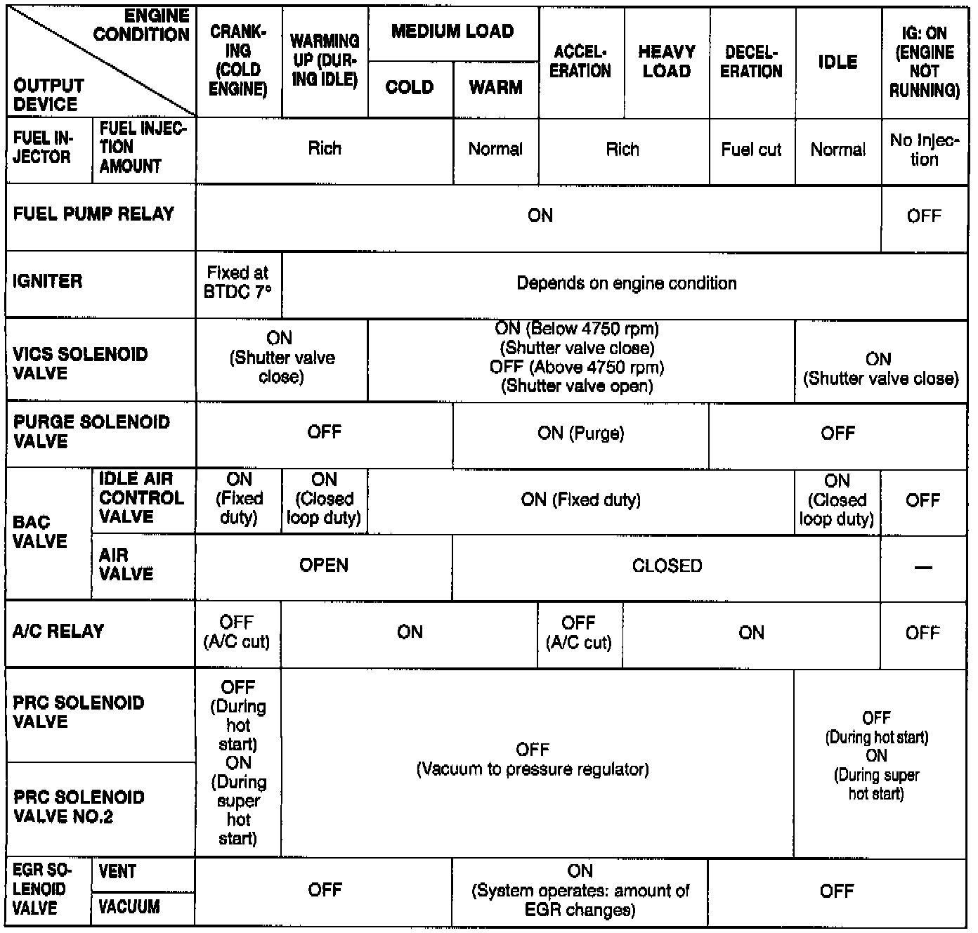 Engine Control Operation Chart: