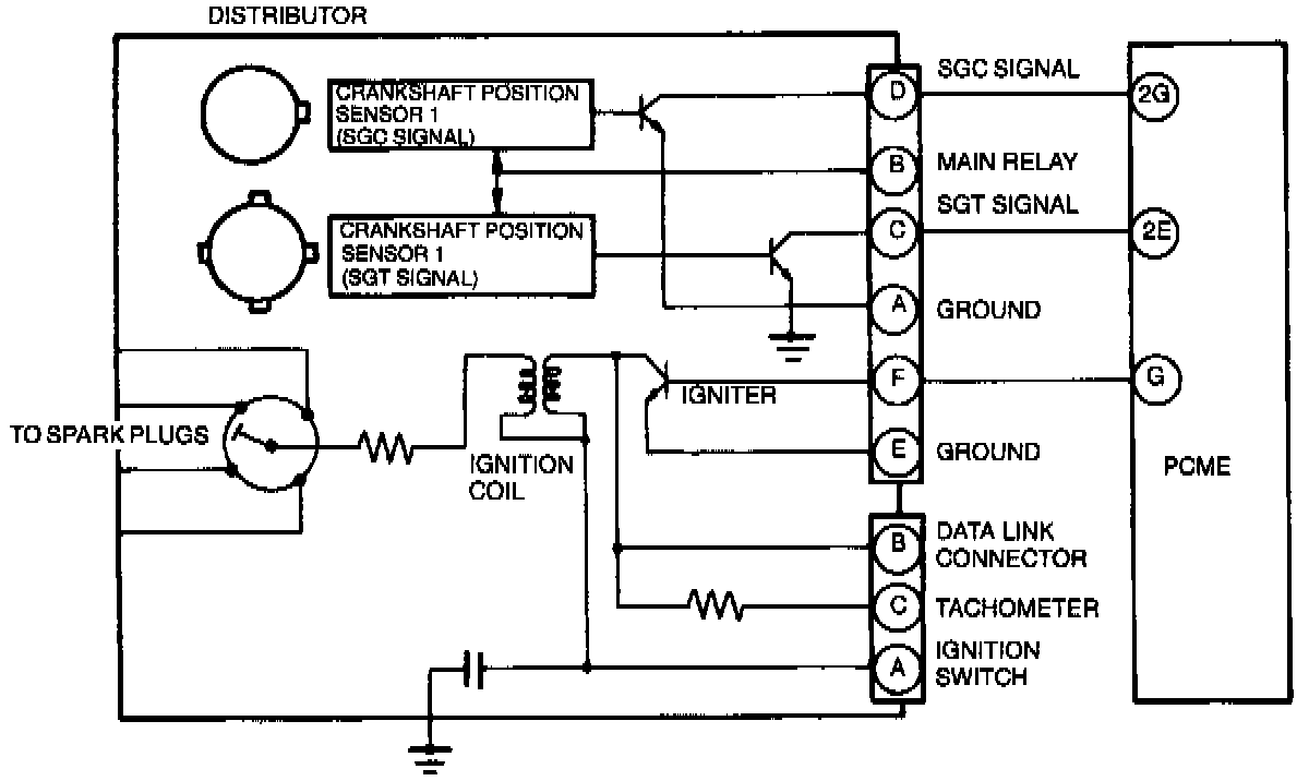 The PCME determines optimum ignition timing from various inputs and transmits a primary current OFF signal to the igniter. The igniter interrupts the current flow through the ignition coil's primary circuit which results in a secondary spark discharge from the coil.