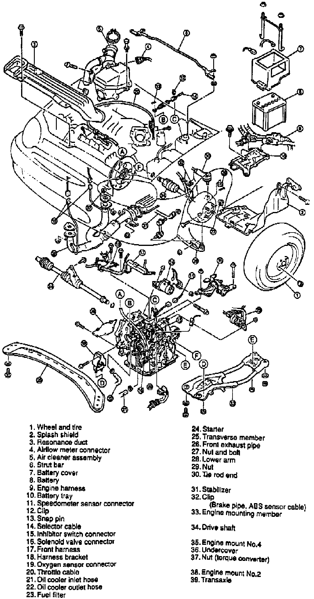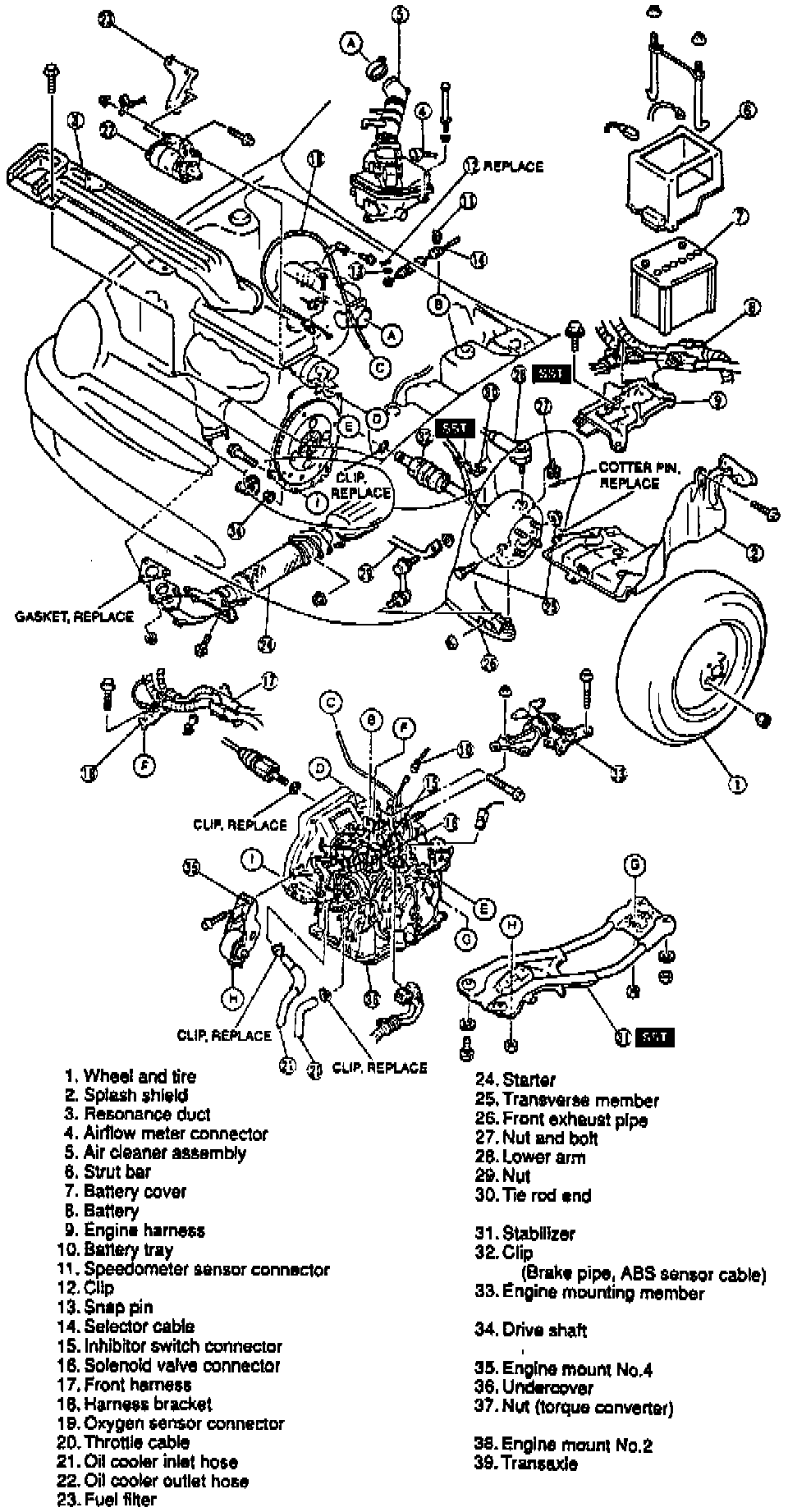 23. Lean engine toward transaxle by loosening engine support hook bolt, then support transaxle with suitable jack.
