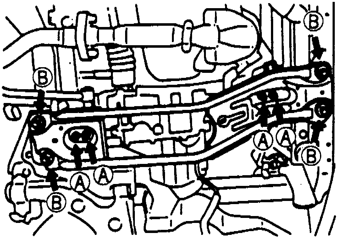 b. Torque engine mounting member A bolts to 27 - 38 ft.lb., then torque B bolts to 47 - 66 ft.lb., Fig. 8.