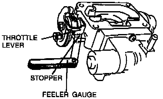 3. Insert a 0.5 mm (0.020 in) feeler gauge between stopper and throttle lever. Verify that there is no continuity across terminals C and D.
