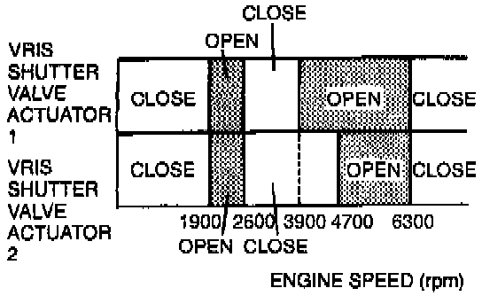 3. Open throttle and verify that rod is pulled into shutter valve actuators 1 and 2 at engine speed specified on chart.