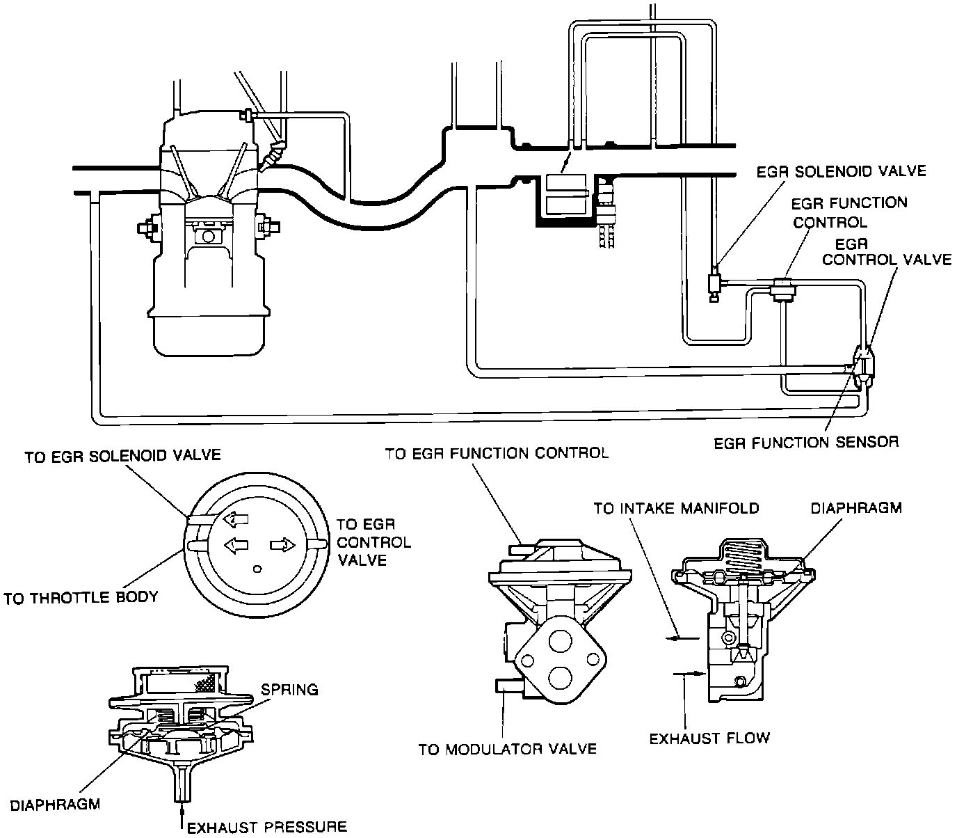 System recirculates a portion of exhaust gas through the EGR valve and intake manifold into the combustion chambers. To improve cold engine driveability, system does not operate when coolant temperature is below 122°F (50°C).