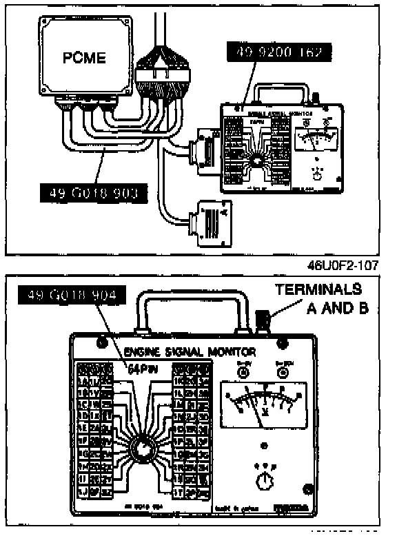 1. Unplug PCME connectors and connect Mazda SST as shown (or aftermarket equivalent). Use connector A of the adapter to check voltages at terminals 1A through 1V and at terminals 3A through 3Z. Use connector B to check voltages at terminals 2A through 2P.