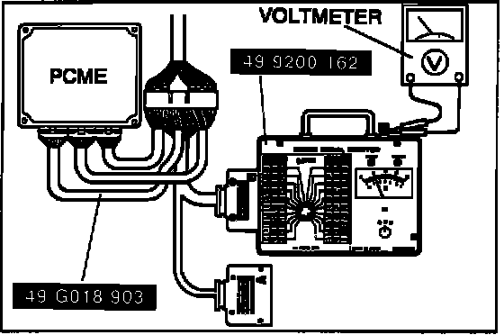 2. Connect Engine Signal Monitor (SST 49 9200 162) to PCME. Connect voltmeter to output connectors as shown.